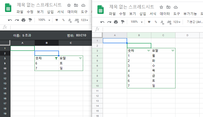 예를 들어 두명의 사용자가 같은 시트를 보다가 필터를 적용할 경우 아래와 같이 함께 필터된 자료가 보여집니다.
